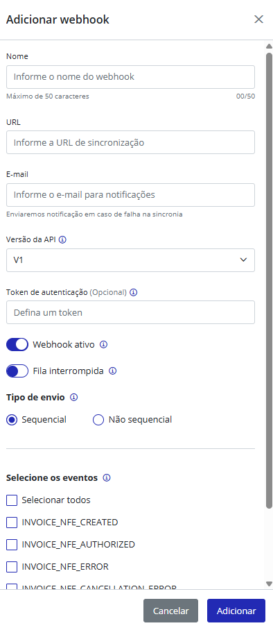 - Informar se o webhook será criado com a fila de sincronização interrompida ou não;