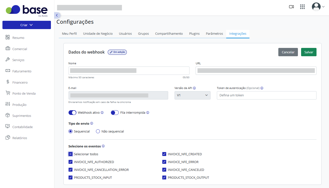 asaas-access-tokenem todas as chamadas do Base para sua aplicação; - Informar se o webhook será criado habilitado ou desabilitado;